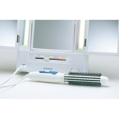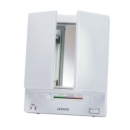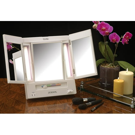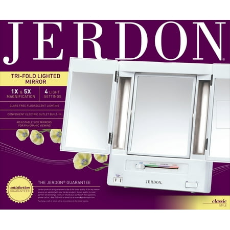 Jerdon Style Tabletop Tri-Fold 2-Sided Lighted Makeup Mirror with 5x Magnification and 4-Light Settings, White JGL9W:Bathroom and makeup mirror with cool-to-the-touch fluorescent lightingAdjustable magnification, versatile illumination and multiple viewing anglesDesigned with a sharp look and attractive white finish to match any home decorStands up by itself on your countertop, vanity or dresser with a folding back standGlare-free fluorescent lighting with 4 adjustable settings for color correct lighting selections that areIdeal for daytime, evening, home and office environmentsCenter mirror swivels from 1x to 5x magnification, while the 2 side mirrors are adjustable for a panoramic viewConvenient 120V electrical outlet built-in for curling irons, blow dryers and other appliancesDimensions: 12.75″L x 3.75″W x 10.75″HColor: WhiteFolds flat for travel or easy storageEquipped with a cord to plug into an electrical outlet1-year limited warrantyModel# JGL9W