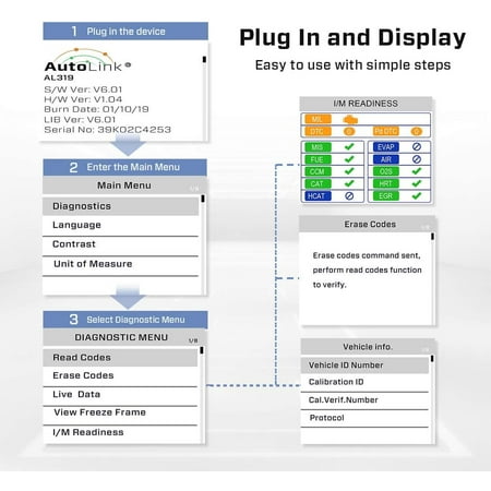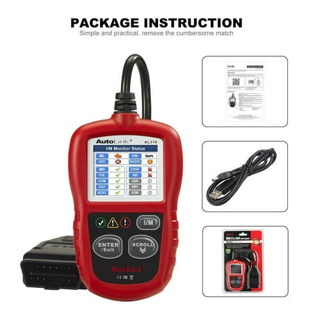 FOR END USER & DIYERS :This error code reader is ¡°plug and play¡± and comes with an easy interface. Even if you¡¯re not familiar with vehicle repair, you can quickly take control of this code reader, and get the information you want. TURN OFF CEL: This car diagnostic tool supports Reading DTCs, displaying Live Data, Freeze Frame & I/M Readiness etc to figure out the root cause of the Check Engine Light (CEL) and turning it off, to help you detect any potential problems, and to avoid excessive costs for unnecessary repairs. EXTENSIVE APPLICATION: Compatible with 7 languages (English, French, Spanish, etc.) and various post-1996 OBD II protocol vehicles (Toyota, Nissan, Honda, Ford, etc.), this OBD II scanner provides accurate and fast diagnosis for worldwide car owners. USER-FRIENDLY DESIGN : This check engine code reader features a patented One-Click I/M Readiness Key, TFT color display, built-in speaker, LED Indicator etc. The cable is long enough without being too long and getting in the way. No batteries are needed. HIGH-QUALITY SERVICES : 12 months warranty from the date of purchase and lifetime free update are offered by this Automobile OBDII scan tool. Welcome to contact us via Q&A, email, or hotline, and our after-sale-service team for technical support. Why You Need Autel OBD2 Scanner AL319? 1. OBDII function: available to read codes / clear DTCs (turn off MIL), and read freeze frame data, and data stream for accurate diagnosis. 2. Patented One-Click I/M Readiness: quick State Emissions readiness check and verification. 3. DTC Definition: the code reader displays DTC definitions in English, Spanish, French, etc. on the TFT screen. 4. Unique Design: Based on bright color-coded LED and built-in speaker, the scanner offers both visual and audible indication.