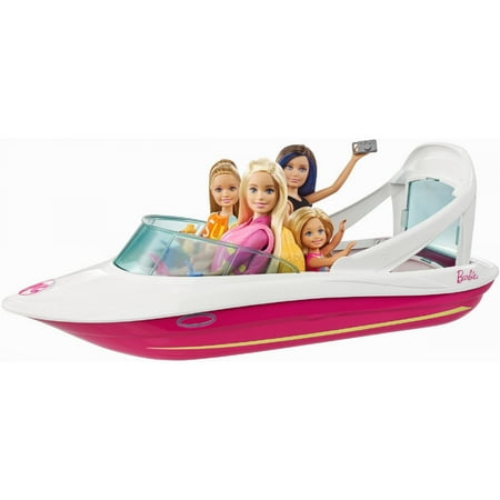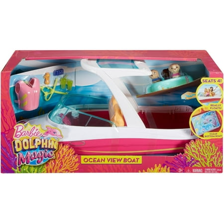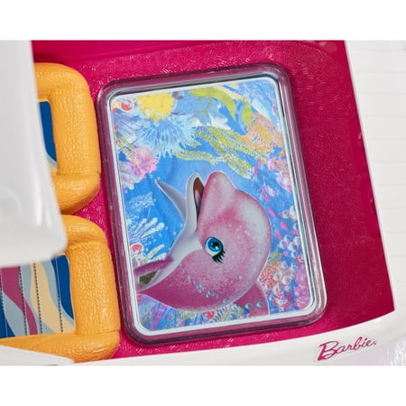 A life vest and snorkel mask for a doll make a splash. Two drink cups, a bottle of sunscreen and a camera add to the tropical fun. Fans will love recreating scenes or telling their own tales above and below sea level because with Barbie, you can be anything! Collect all of the dolls and accessories from the Barbie Dolphin Magic line (each sold separately). Includes floating Barbie Dolphin Magic Ocean View Boat with canopy and “glass bottom,” three puppies, floating raft with cord attached to boat and themed accessories; doll not included. Colors and decorations may vary. Barbie Estate Dolphin Magic Ocean View Boat with 3-Puppies & Accessories: Age Range: 3Y+ Dive into an ocean of fun with the Barbie Dolphin Magic Ocean View Boat inspired by Barbie Dolphin Magic – it really floats! The sleek pink, white and yellow boat comes with three puppies and lots of accessories to recreate the action Fold down the canopy to seat Barbie doll and all of her sisters (dolls sold separately) A “glass” bottom reveals underwater sea life, like a cute dolphin rising up to say hello A floating raft fits all three puppies and can be attached to the boat by a cord to give them an exciting ride! A life vest and snorkel mask for a doll make a splash. A life vest and snorkel mask for a doll make a splash Two drink cups, a bottle of sunscreen and a camera add more tropical storytelling play Fans will love recreating scenes inspired by the show or telling their own tales above and below sea level because with Barbie, you can be anything! Collect all of the dolls and accessories from Barbie Dolphin Magic (each sold separately)Little ones will love imagining new adventures and making a storytelling splash with Barbie Estate boats and outdoor-themed playsets.