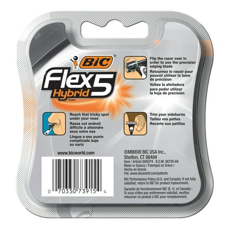 Achieve the look you want with the BIC Flex5 Hybrid Men’s Razor. This razor features five flexible blades that individually adjust to the contours of your skin, while a precision edging blade helps you trim tricky spots like under the nose or sideburns. This men’s razor also enhances shave control thanks to a razor head that pivots 40 degrees and its Balancing Sphere that provides extra weight to the handle for a comfortable, firm grip. With one handle and four refillable cartridges in each pack, this disposable razor offers convenience, performance, and value!