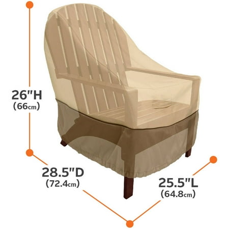Fits standard patio chairs 25.5″L x 28.5″D x 26″HGardelle Fabric System features an elegant fabric top with a protective water repellent and resistant laminated backing and a protective dark splash guard skirtAir vents reduce inside condensation and wind loftingPadded handles for easy fitting and removalElastic hem cord for a tight and custom fitClick-close straps snap at front to secure cover on the windiest daysThree-year limited warranty