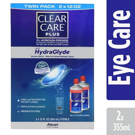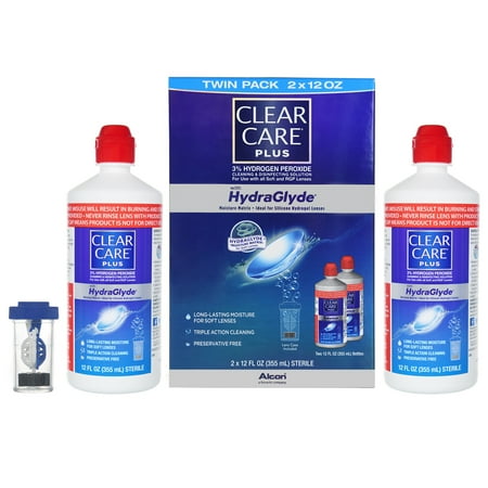 The #1 doctor recommended peroxide brand Deep cleans, loosens dirt, and enhances protein removal with Triple Action Cleaning Includes a special contact lens case for cleaning and disinfecting With HydraGlyde Moisture Matrix for long-lasting moisture Twin Pack of 2 bottles at a great value We took the awesome power of CLEAR CARE® Cleaning & Disinfecting Solution to the next level. Not only does CLEAR CARE PLUS Solution clean and disinfect your contact lenses with the bubbling power of hydrogen peroxide, it also surrounds your lenses with long-lasting moisture. Clean and comfortable lenses? You got it. Powerful Cleaning and Disinfecting with Long-Lasting Moisture CLEAR CARE PLUS Solution cleans and disinfects like no standard multi-purpose solution — with the bubbling power of peroxide. Our Solution deep cleans your lenses with the power of peroxide, then neutralizes into a gentle saline solution — much like your own tears — but without the chemical preservatives found in multi-purpose solutions. You can even see it working! Our proprietary HydraGlyde Moisture Matrix wraps your soft lenses in long-lasting moisture for a fresh lens feeling. Disinfect your Lenses with 3% Hydrogen Peroxide CLEAR CARE contact cleaning solutions use hydrogen peroxide to help prevent eye infections by killing harmful germs and bacteria on contact lenses. They work with a special lens case to create a bubbling action you can see that actively cleans and removes debris from your lenses so your lenses are clean and comfortable. CLEAR CARE is also preservative-free which means no preservatives or chemicals from multi-purpose solutions enter your eyes. CLEAR CARE Contact Lens Case Included! So, what’s with the cool little contact lens case? If you’ve never used CLEAR CARE before, the lens case might look a little strange. Here’s how it works: The 2 lens baskets hold your contacts in place, and the fill line on the case helps you use just the right amount of solution for your lenses. The Platinum Disk inside activates bubbles to clean your lenses by neutralizing the hydrogen peroxide into a gentle saline solution, much like your own tears. How to use CLEAR CARE Solution Just follow these simple steps and you’ll be good to use CLEAR CARE on your soft contact lenses: Wash, rinse, and dry your hands. Then, place your lenses in the baskets and rinse for 5 seconds with solution. Fill the case to the line with CLEAR CARE, put the case and lid together, and tighten. Then, just let your lenses soak overnight or for at least 6 hours, then enjoy your newly clean lenses! Red cap alert! The red cap on CLEAR CARE contact cleaning solutions means you should never put CLEAR CARE or CLEAR CARE PLUS directly in or around your eyes. For further instruction and more information on proper eye care, visit our website. CLEAR CARE contact cleaning solutions and eye care products are available online at or in-store at a Walmart near you! Check out our smaller 3-ounce bottle of CLEAR CARE PLUS, or try our original formula, CLEAR CARE.