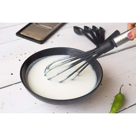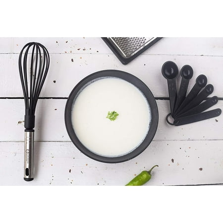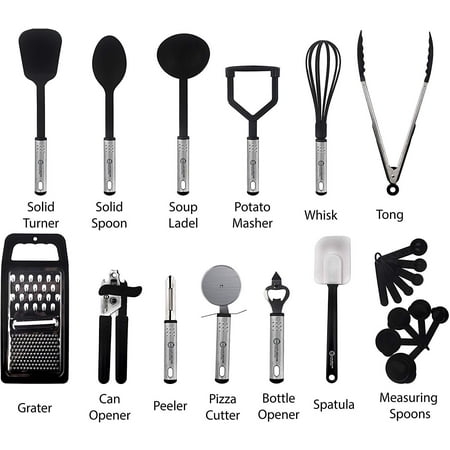 Lux Decor premium 23 Piece Black Cooking utensils set makes your cooking faster. Its consists of almost every kitchen tool that you need for cooking such as for breakfast, lunch, and dinner. With this modern multi-functional kit, you have everything at hand you need for cooking, no matter what dish you are planning to make.This simple yet complete line of tools and gadgets will make a beginner feel like a professional.What’s in the Box?Solid SpoonSolid TurnerLadlePizza CutterBottle OpenerPeelerCan OpenerFood TongMeasuring SpoonsMeasuring CupsGraterWhiskSilicone SpatulaPotato PressDay to Day Food PrepsCooking Utensils, Kitchen Gadgets & Measuring Cups DetailsIncludes 1 Ladle,1 Tong, 1 Solid Spoon, 1 Slotted TurnerHeat resistant up to 400 degrees F Safe to use with nonstick cookwareBPA free food-grade materialsGadgets: 1Can Opener, 1bottle opener, 1Whisk, 1Grater, 1Pizza Cutter, 1Peeler, 1Masher, 1SpatulaGadgets material: Stainless Steel, Silicone, and thermoplastic rubber (TPR)Collapsible Measuring Cups: 1 cup, ½ cup, ? cup, ¼ cup (8 oz, 4 oz, 2.7 oz, 2 oz)Measuring Cups material: Silicone BPA free food-grade materialsCare:Do NOT clean in the dishwasherFor full care instructions and safety warnings, always refer to the product box and manualHand wash ONLY