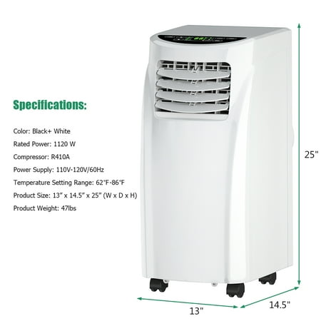 The Costway 8000 BTU Portable Air Conditioner and Dehumidifier Function Remote measures 12″Lx 13″W x 24.5″H and functions with a noise level of 56 dB. Costway 8000 BTU Portable Air Conditioner and Dehumidifier Function Remote w/ Window Kit: Cool, dehumidify, fan and sleep modesIdeal for home and office useDehumidifies up to 50 pints per 24 hoursTemperature setting range from 62 to 86 degrees Fahrenheit Programmable 24 hour timer8000 BTU cooling capacityTwo fan-speed level accessible by LED control panel and remote controlQuick-install window kit and exhaust hoses includedTwo-way up/down air deflection circulates air evenlyCostway 8000 BTU air conditioner covers area up to 161 sq ftMeasures 12″L x 13″W x 24.5″HRefrigerant/charge: R410A/13.4 ozPower supply: 110V-120V/60HzRated input: 1120 WRated current: 10.0 ALow side pressure: 250 psiHigh side pressure: 580 psiAir flow: 380 m³/HAC coverage area: 161 sq ftNoise: 56 dBFilter type: washableExhaust hose can extend from 11″ to 5′