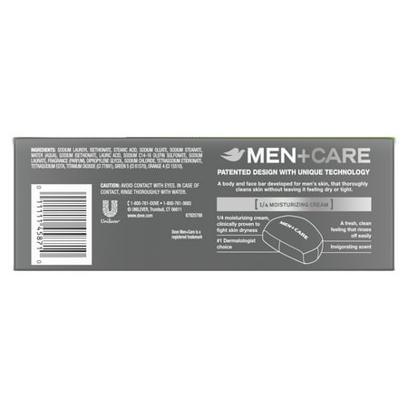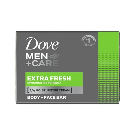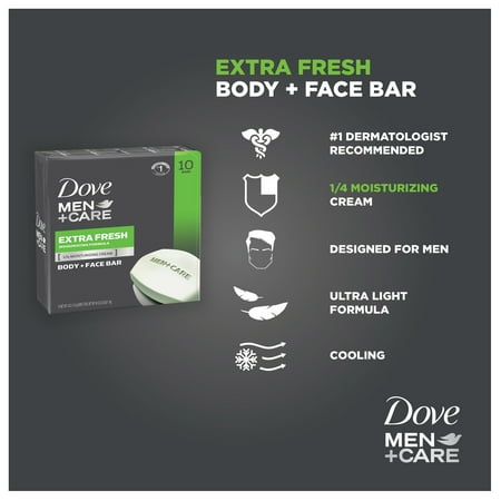 Dove Men+Care 3 in 1 Bar Extra Fresh 3.75 oz 10 Bars:HYDRATE YOUR SKIN: Unlike regular bar soap that can dry out skin, Dove Men+Care Extra Fresh Body and Face Bar deeply cleans and hydrates skin, leaving skin feeling smooth and comfortable This face and body bar is formulated with more moisturizer than ordinary body soap and washes off easily to leave skin feeling healthy3 IN 1 FOR BODY, FACE, AND SHAVING: Dove Men+Care Extra Fresh Body and Face bar formulation is so hydrating and gentle on skin that you can also use it to wash your face or to shaveREFRESHING CLEAN: Feel clean and invigorated with this hydrating body and face bar and enjoy its crisp, refreshing scent of Mandarin Citrus, Patchouli, and RosemaryDESIGNED FOR MEN: Men’s skin is different. Men sweat more, have thicker skin and lose hydration faster. Dove Men+Care is specifically developed for men’s skin to protect it against skin drynessPLEDGE FOR PATERNITY: We’re committed to making paid paternity leave the new standard