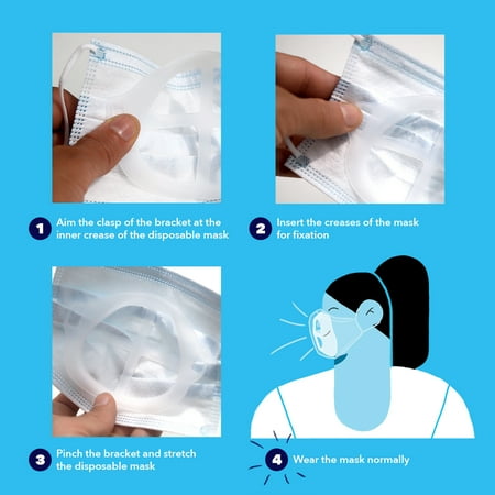 COMFORTABLE BREATHING: This face bracket keeps the mask fabric off the mouth to create more breathing space for comfortable breathing. Perfect use for disposable face masks, cloth face masks, and homemade face masks.ULTIMATE MASK SAVER: The Mask Frame is the perfect lipstick protector! 3D Mask Bracket can reduce the frequency of friction between the mask and the face to protect the mask lining from being soiled and to protect the makeup.NO MORE FOG: If you wear glasses, this inner support frame can prevent the glasses lens from fogging because of the increased breathing space between the frame and mask. You never have to worry about wearing a mask and glasses at the same time.WASHABLE and REUSABLE: The 3D Face Mask Insert is made of Silicone material. We recommend simply washing the Mask Bracket before and after use with warm water and mild soap for reuse. We also suggest disinfecting the bracket before each use.WEAR SECURLY: Wear this breathable Mask Bracket securely without slipping. Mask Brackets are tailored for use with masks. The snap fastener can be hung firmly in a disposable mask without slipping. Made of soft silicone plastic that prevents hurting your face and the snaps hang firmly in the mask. Never worry about it slipping!