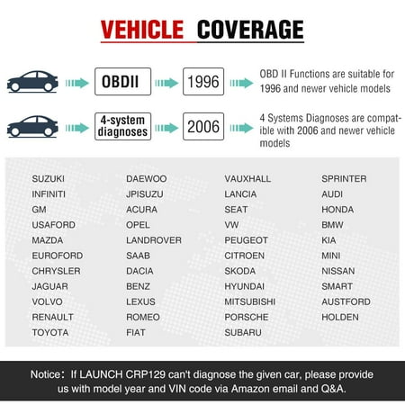 ★COMPREHENSIVE SCAN TOOL★ Featuring reading/clearing codes and viewing live data for four important systems (engine/transmission/ABS/SRS) and special reset functions (Oil Reset, EPB/SAS Reset), this scan tool is a great choice for mechanics to facilitate their diagnostic analysis★WIDE VEHICLE COVERAGE★ LAUNCH CRP129 code reader works on over 40 OBD2 complaint vehicles after 2006, and the diesel models of 12 Voltage. You may consult us about the coverage via Q&A/Email before purchase, leaving out unnecessary time and troubles★FULL OBD2 FUNCTIONS★ To most car owners, an obd2 scanner’s ability to read codes and do smog tests is what matters. This launch OBD2 scanner supports full OBD2 tests including I/M readiness and O2 sensor tests etc., that will keep your mind from worrying about emission checks★USER-FRIENDLY DESIGNS★LAUNCH CReader CRP129 is 7.4 inches long and 4.4 inches high, enabling it to be easily operated and stored. It displays data clearly with TFT LCD screen and responses within seconds, making diagnostic work smooth, simple and fast★WARRANTY & UPGRADE★The diagnostic tool provides 12-month warranty from the date of purchase and lifetime free online upgrade. Notice: The upgrade can be finished with Window-based computer ONLY. The “Password”, i.e. register code, can be found in “help” application★The reason to choose scan tool LAUNCH CRP129★Diagnoses of 4 systems – Engine, Transmission, ABS, Airbag (SRS)Reset functions – oil reset, EPB reset and SAS resetMultiple car models (covering over 40 prevailing models from Asia, America and Europe)Support all 10 test modes of the OBDIIRead DTC & Clear DTCDisplay DTC help information and service informationOxygen sensor test, carbon canister testDynamic data stream graphic displaySupport lifetime free online upgradeSupoort diagnostic report printingMultiple languages support: English French German Spanish Portuguese Russian Japanese Italian★Real-time DataStream Analysis★The LAUNCH CRP129 scanner can read data streaming for OBDII/ ENG / AT / ABS /SRS (Airbag), which shows the specific four systems live data readiness and allows you to analyze the real-time data stream via a waveform display, for quickly and accuratelydiagnostics.★Lifetime Free Online Update★Not just featuring riches of easy-to-use diagnostic functions, the CRP129 scanner also gets access to free software updates via the internet-connected PC with multilingual support. You’re able to update the diagnostic software on your Windows or Macwith a TF card.★DTC Lookup and Recording Data Function★DTC Lookup: Built-in DTC lookup library, Retrieves generic (P0, P2, P3, and U0) and manufacturer specific (P1, P3, and U1) code, show definitionsRecording Data Function: Review or delete the recorded DTC, data streams, and freeze frame. You can check it on device diagnosis menu the “Review” part to check.