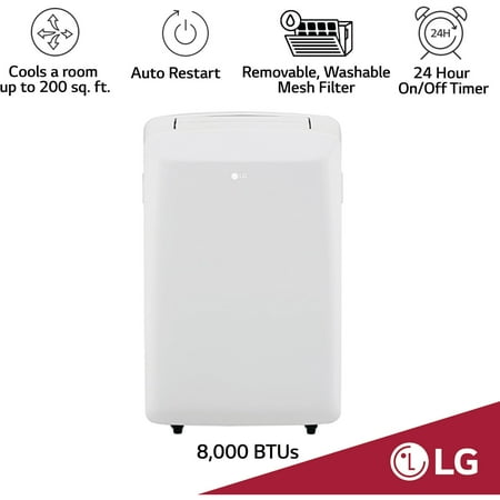 COOLS UP TO two hundred SQ. FT.: Stay cool and cozy while Mother Nature turns up the heat! This eight,000 BTU (five,500 BTU DOE) transportable air conditioner can cool rooms up to 2 hundred sq. ft (10’x20’ room size).OSCILLATING AIR DISCHARGE: Inclined pinnacle air discharge swings up and down to sweep air calmly in the course of the room, getting rid of warm spots. Oscillation function may be became off the usage of faraway manage.INSTALLATION KIT INCLUDED: Slide-collectively window bracket has click-lock connection point for exhaust hose. Other give up of exhaust hose slides securely into vicinity on the back of the air conditioner. Installation kit suits vertical and horizontal windows from 18″ to 50″. Detailed set up instructions covered.SLEEK TOUCH CONTROLS: The control panel on this LG transportable air conditioner functions glossy digital touch controls and an LED screen, making switching between the 3 modes and a pair of fan speeds easy. An protected LCD far flung manipulate reflects the unit settings from across the room.AUTO-EVAPORATION SYSTEM: The bucketless design of this LG transportable air conditioner is way to the automobile-evaporation gadget built into this version. Moisture created with the aid of the cooling system is evaporated inside the unit, permitting you non-stop operation without having to often empty a bucket.8000 BTU (ASHRAE-128 Standard) / 5500 BTU (DOE 2017 Standard)Uses a standard 115-volt/15 amp electric outlet (6′ long energy wire)LG 115V transportable air conditioner cools a room as much as two hundred squarefeet with up to at least one.eight pints in step with hour dehumidificationTop, inclined air discharge with auto swing louvers facilitates put off warm spotsConvenient LED show panel and LCD far off controlProgrammable 24-hour on/off timer cools to your scheduleLG 8000 BTU portable air conditioner has 2 fan speeds and a pair of cooling speeds for flexibilityAuto-restart saves your settings when the strength is going outRemovable, cleanable mesh filter out cleans the airEasy-roll caster wheels and facet handles allow for smooth movementLG 115V transportable air conditioner consists of clean-to-deploy window exhaust kitU.L. listedColor: whiteLG 8000 BTU portable air conditioner dimensions: 12.8″ L x 16.nine” W x 27.4″ H