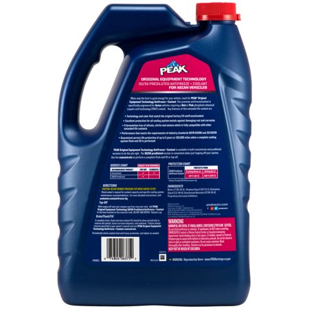 PEAK ORIGINAL EQUIPMENT TECHNOLOGY ANTIFREEZE + COOLANT for ASIAN VEHICLES is a line of premium coolants specifically designed to match the technology and color requirements of Asian vehicles. Each coolant is formulated with the same corrosion inhibitor technology that protected your vehicle straight from the factory. Color cues on the packaging and a list of covered vehicles on the front label make it easy to identify the right match for your specific vehicle. PEAK ORIGINAL EQUIPMENT TECHNOLOGY ANTIFREEZE + COOLANT for ASIAN VEHICLES – RED/PINK is an ethylene glycol-based antifreeze/coolant specifically developed for use in any Asian vehicle requiring a Red or Pink phosphate-enhanced organic acid technology (POAT) formulation. It contains high-quality organic acid corrosion inhibitors and is free of borate, nitrite, silicate and amines chemicals. PEAK ORIGINAL EQUIPMENT TECHNOLOGY ANTIFREEZE + COOLANT for ASIAN VEHICLES – RED/PINK meets the performance requirements of ASTM D3306 and JIS K2234. With a complete flush and fill, PEAK guarantees this coolant will provide service life protection of up to 150,000 miles or 5 years.