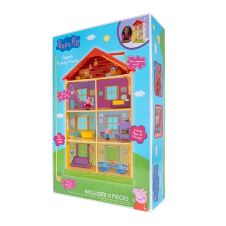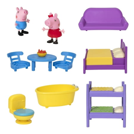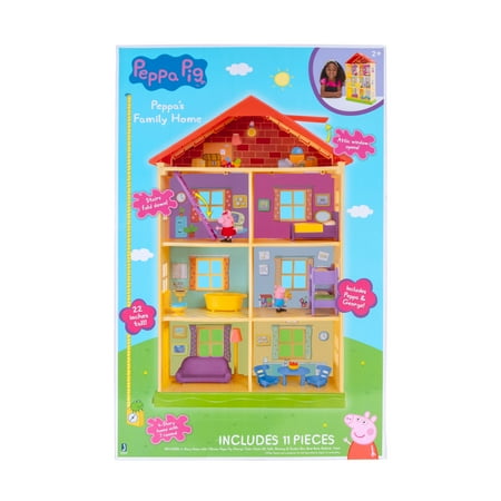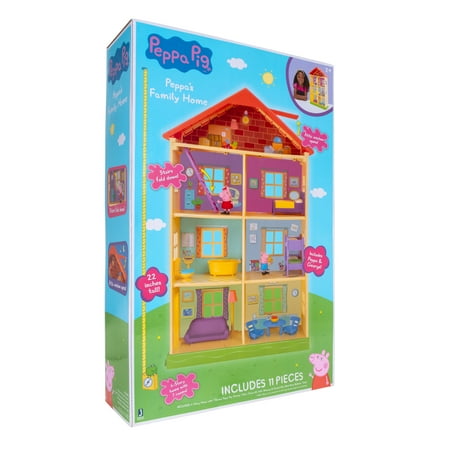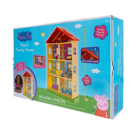 10 oinktastic pieces! With 4 stories and 7 different rooms to explore, there’s so much to do at Peppa’s Family Home!This playset includes a Peppa Pig figure, and a George figure. Lounge on the sofa in the living room, then grab a snack in Peppa’s kitchen! Peppa’s Family Home comes with 8 cool accessories including George and Peppa’s bunk bed, Mummy Pig and Daddy Pigs bed, a toilet, and even a bathtub! Push open the roof on the top floor, and star gaze with all your favorite World of Peppa characters!