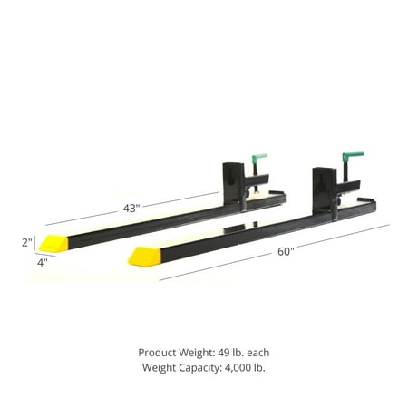 VERSATILE EQUIPMENT: These pallet forks can be attached over the cutting edge of the bucket of tractors and secured into place with the clamps. This kind of versatility creates an opportunity for you to use it across various brands of tractors, such as the Ford 8n, 9n, Kubota, or John Deere tractors. It’s a great addition to your farm accessories but can also be used to haul building supplies.4,000 LBS CAPACITY: Through superior design, we’ve created our Titan tractor fork attachments to be able to hold weight up to 4,000 pounds. This means that they are able to lift heavy things like fence posts, lumber, pallets, logs, or other parts you need moved around. Simply slide the clamp over the edge of your bucket and lock it in place for a sturdy heavy-lifting solution.ROLL BACK PROTECTION SLOTS: Part of what makes up our professional design is our focus on safety. When you need a quick solution for hauling lumber or a hay bale, you shouldn’t need to sacrifice your, or anyone else’s, safety. Our roll back protection slots can help keep your heavy loads right on the forks where they should be.CHAIN HOLES FOR HEAVY LIFTING: Being able to secure your heavy load onto the forks of your front loader is crucial for both safety and efficiency. As part of our exceptional design, we’ve included chain holes so that you can use chains to secure loads and to act as a stabilizer for heavy equipment or the larger load that you are moving.HEAVY-DUTY MATERIAL: Working with heavy lifting and large loads mean that we had to create something that would be durable. We’ve used a heavy-duty material and expert welding to construct the forks and the thick, rectangular tube walls. The length of each fork is 43” and the fork width is 4”. The total length, once installed, is 60”.