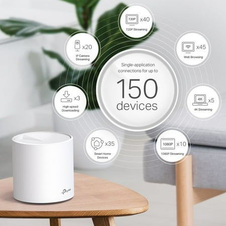 Wi-Fi 6 Mesh: Next-gen Wi-Fi 6 AX1800 whole home mesh system to eliminate weak WiFi for good. • Whole Home Coverage: Cover up to 4,000 sq. ft. with seamless, high-performance WiFi 6 and eliminate dead zones and buffering • No-Drop WiFi: Ensures you’re always connected even as you walk from room to room using a single name and password to connect. • Connect More Devices: Deco is strong enough to connect up to 150 devices with strong and reliable WiFi. • Total Security: Safeguard your home network and every connected device against intruders, viruses and malware with advanced WiFi encryption and automatic updates to keep you secure, always. Add another layer of security with advanced antivirus with TP-Link HomeCare. • Easy Setup and Management: The Deco app helps you set up your network in minutes with clear visual guidance and keeps you in control even when you are not home • Peace of Mind with Parental Controls: Manage, limit and monitor internet use with profiles that let you customize WiFi access for every person and device in your home • Universally Compatible: Backward compatible with all WiFi generations, ideal for any internet plan up to 1 Gbps, and works with any internet service provider (ISP) and modem